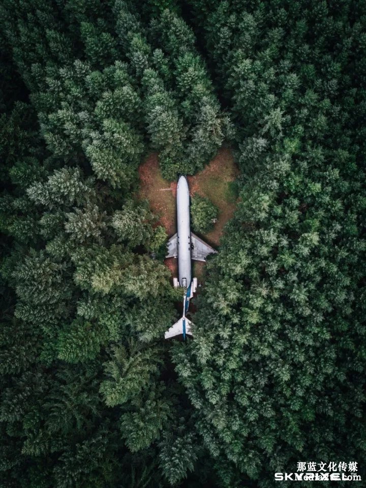 一架飛機(jī)殘骸靜靜地躺在茂密的樹林中。