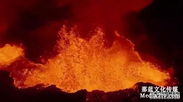 從火上口中噴起的巖漿,無人機(jī)在上空拍攝。