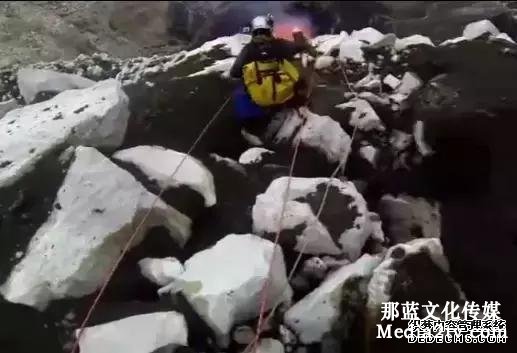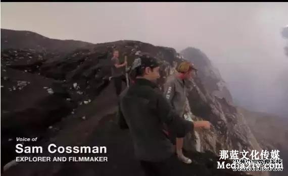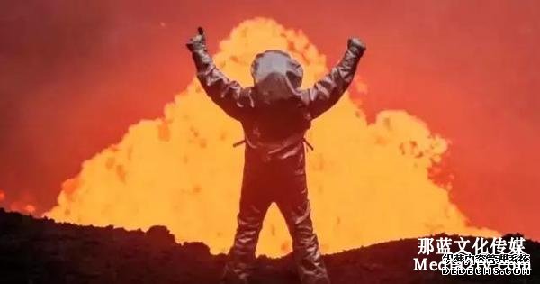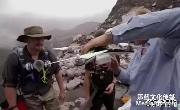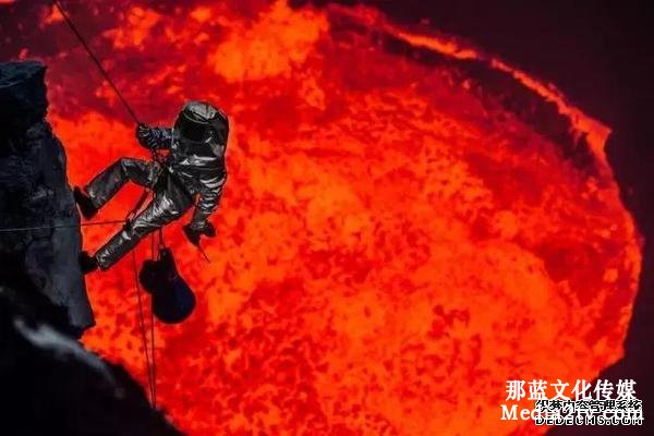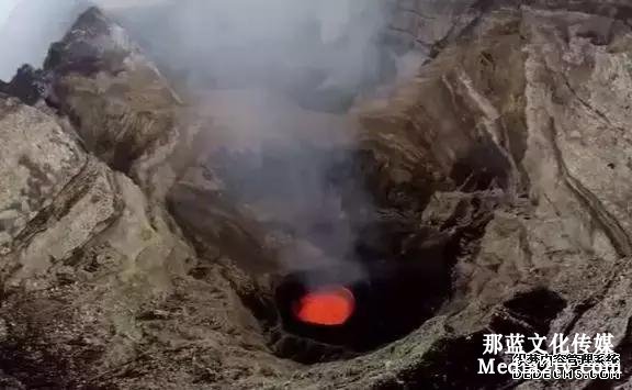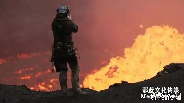 位于國外的一個火山口,畫面下方是穿著保護(hù)服的人員。